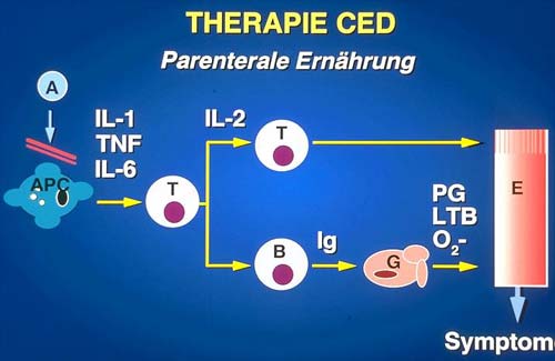 In einigen Fällen sind alle medikamentöse (und chirurgischen) Therapieversuche nicht in der Lage eine schwierige klinische Situation zu beherrschen. Dies gilt zum Beispiel für Kinder in der Wachstums- und Reifephase, die unter einer chronisch aktiven CED leiden. Alle hochwirksamen Medikamente können eine zusätzlich Wachstumsretardierung (=Verzögerung) bewirken. Hier hilft oft nur eine konsequente enterale Sondenernährung oder parenterale (=durch die Vene) Ernährung durch ein Portsystem (= unter der Haut befindlicher, leicht zu punktierender Metalltrichter, der mit der großen Hohlvene in Verbindung steht). Die Sondenernährung sollte immer als erstes probiert werde, erweist sich aber oft als nicht ausreichend wirksam (auch die leicht aufnehmbare sogenannte Astronautenkost löst im Dünndarm Reflexe aus, die wiederum zu Beschwerden (Durchfall, Schmerzen) führen). Die ambulant-parenterale Ernährung mittels Portsystem ist hochwirksam, verlangt aber ein gutes Training des Patienten.