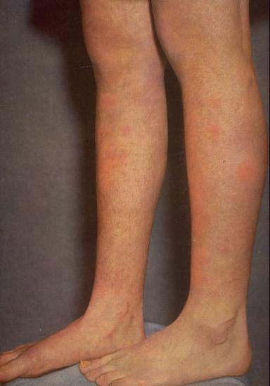 Fünfmarkstück große, leicht erhabene rote Flecken, meist an der Vorderseite der Beine. Gelegentlich sehr schmerzhaft.